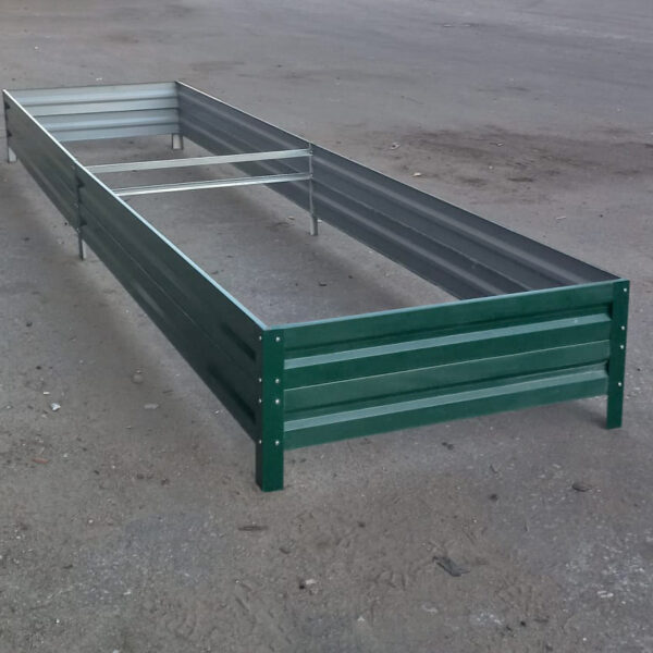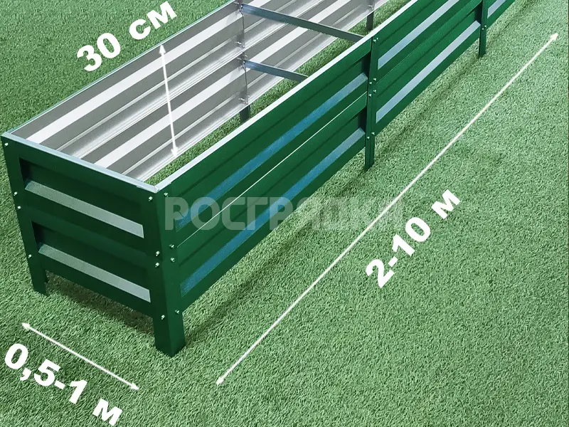 Грядки изготовлены из оцинкованного металла с полимерным покрытием толщиной 0,5 мм. Панели усилены 16 ребрами жесткости. Планка-стяжка через каждый 1 метр обеспечивает сохранность конструкции на долгие годы. Благодаря уникальной технологии, срок службы наших грядок составляет более 10 лет.